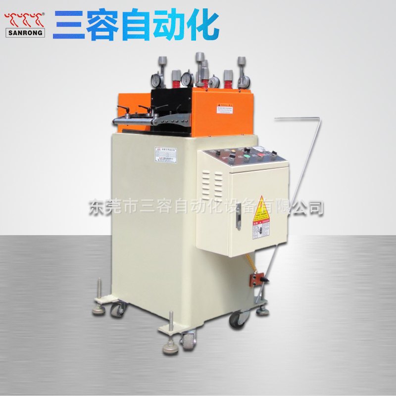 3、本机采用大型气缸压料,矫正调节采用同步蜗轮、蜗杆调节。手柄转动一圈,矫正上轮仅下降1mm可作精细的调整
