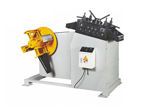 整平送料机在运行时首先由压料臂去压着材料,同时结合托料臂把卷料弯曲的材料头托举到一定的位置,才能通过入料装置,让整个输送过程能够平稳,完成前面步骤。