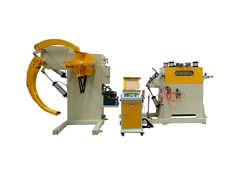 三合一伺服送料机结合了料卷架、上料台车、矫正机、送料机的功能,大大地缩小了以往送料装置所占的面积,且同时可配合冲床工作。装在料卷架上的料卷是由料卷下方的感测器所控制,利用NC送料机可一面整平,一面将预先设定好长度的材料同步送入冲床模具内。